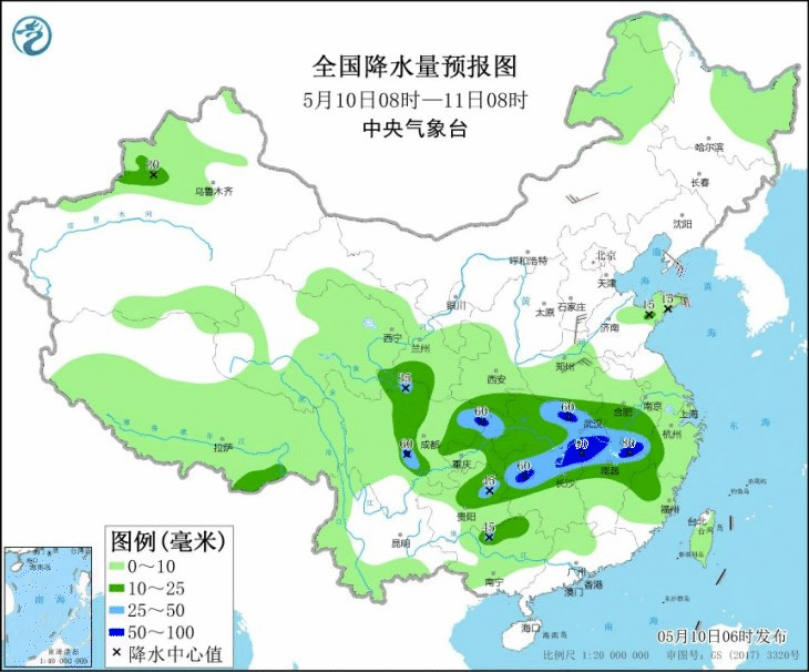 預計5月10日08時至11日08時,四川盆地東北部、重慶中東部、貴州北部、湖北東部和南部、湖南、江西中北部、安徽中南部、浙江西部、福建西北部、廣西北部、山東東部等地將有短時強降水天氣,小時雨強20-50毫米,局地可達60毫米以上。