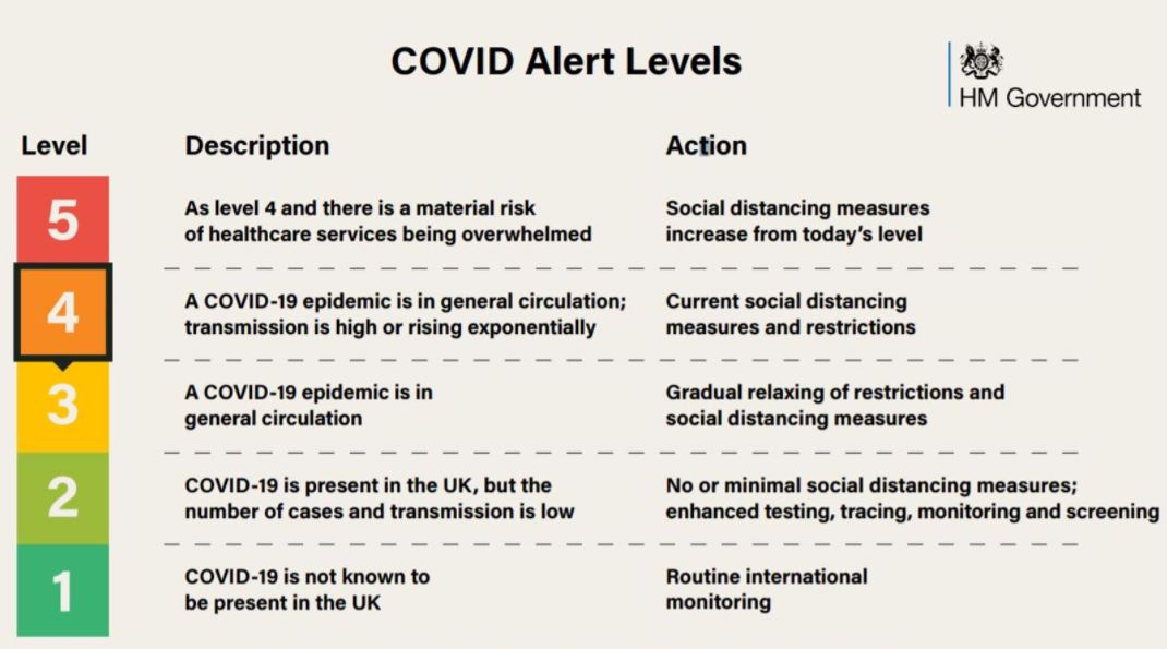 (觀察者網 訊)英國“天空新聞”(Sky News)網站消息,根據英國首席醫療官及專家的建議,10日英國新冠疫情警戒級別從4級降至3級。這意味着英國官方認定,新冠病毒仍在該國普遍傳播,但不再呈指數級增長。伴隨着疫情警戒級別下調,社交疏遠等防疫措施也將有所放寬。