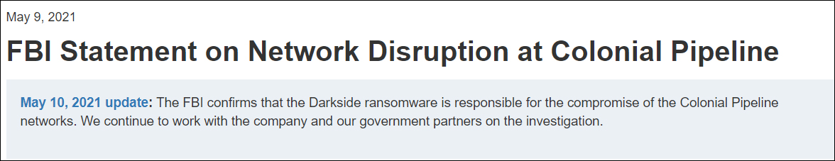 10日當天,美國聯邦調查局(FBI)也向媒體公佈了襲擊事件的調查結論,指控“黑暗面”組織對Colonial公司發動勒索軟件攻擊。不過,兩條聲明之間是否存在時間上的關聯性,還不能確定。FBI表示,正與企業及其他政府部門合作,繼續開展調查。