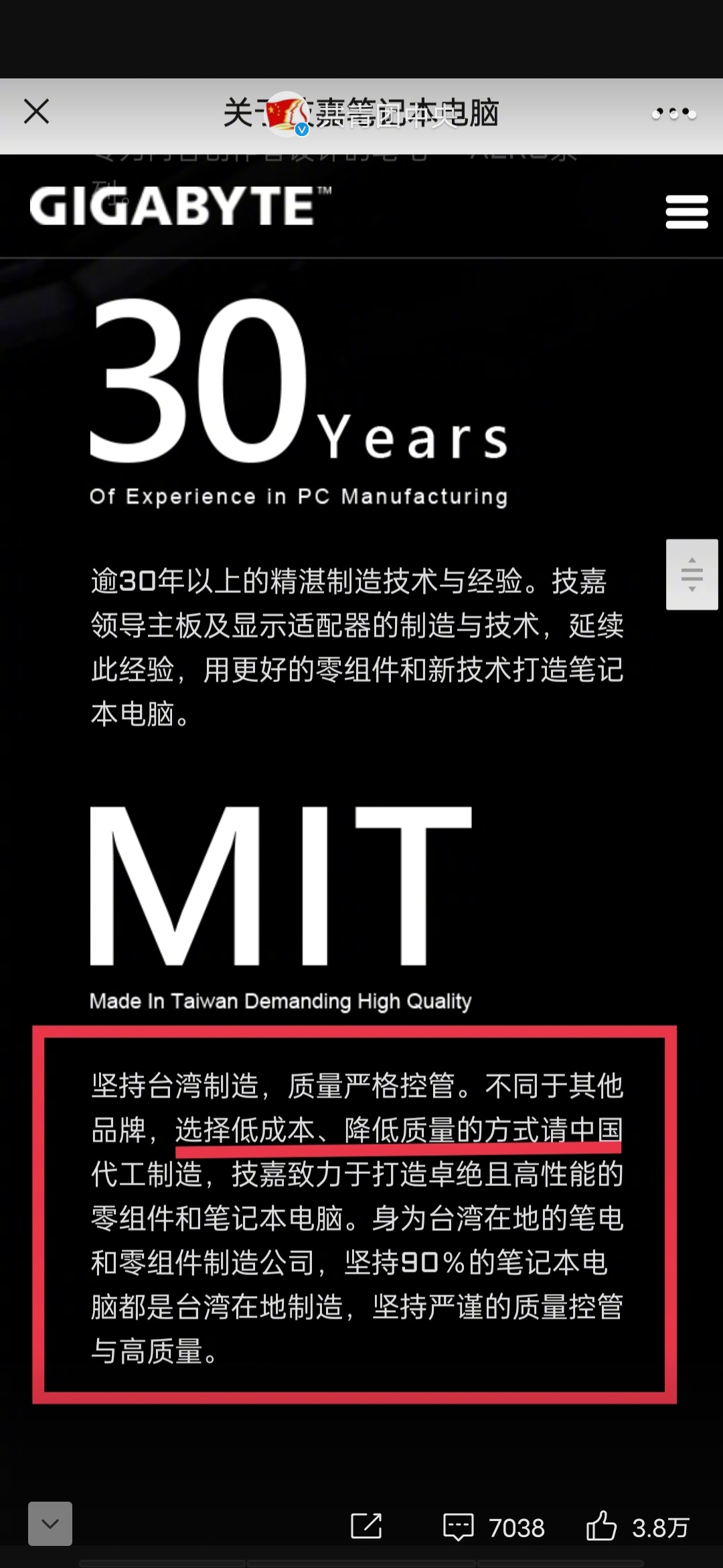 這樣一家在業務上相當成熟的企業,卻公然用“踩一捧一”的手法,對中國(大陸)製造進行惡意貶低,引發眾怒。在其網站上,技嘉聲稱,“不同於其他品牌,選擇低成本、降低質量的方式請中國(大陸)代工製造”,技嘉選擇“堅持(中國)台灣製造,質量嚴格管控”。