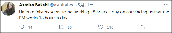 “聯盟部長們看似一天工作18個小時,其實全用來讓我們相信莫迪一天工作18個小時。”