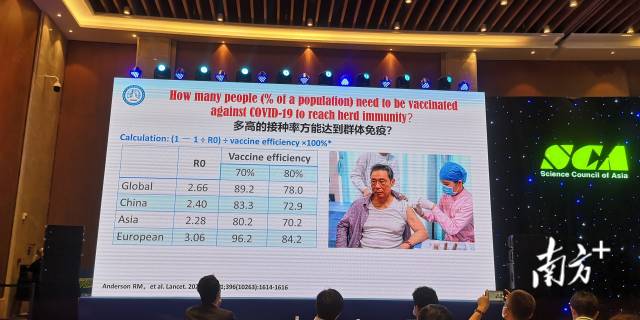 那麼,多高的接種率能達到羣體免疫?在通過舉出智利、土耳其等國的研究案例後,鍾南山曬出一組研究數據,分別列舉疫苗有效性達到70%、80%後,全球、中國、亞洲以及歐洲要實現羣體免疫需達到的接種率。