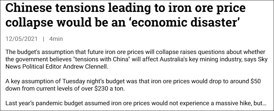 看到鐵礦石價格暴跌,最為沮喪的非澳大利亞莫屬。當地時間5月12日,澳大利亞天空新聞電視台(Sky News)主持人坦言,中澳之間的緊張關係將會影響澳大利亞的主要採礦業,“如果真的發生了(鐵礦石價格從目前的每噸逾230美元降至50美元),那將是國家經濟災難”。
