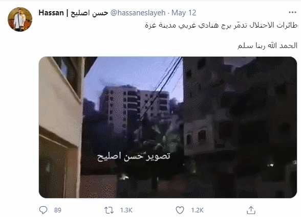 另據以色列國防軍推特13日公佈,以空軍炸燬了加沙南部的一幢14層建築。以色列軍方説,哈馬斯在這座大樓的多層內擁有辦公室,包括軍事情報辦公室和火箭彈研究發展部門。軍方表示,他們在空襲前向樓內平民發佈了警告,給予了他們“充足的時間”以撤離。大樓的垮塌還使1名路人受傷。據報道,12日的“定點清除”共造成16名哈馬斯成員死亡。