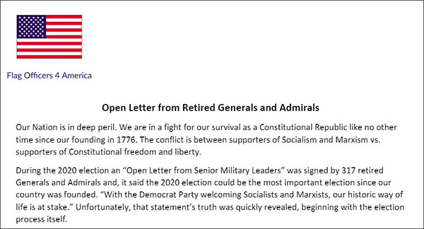 《Politico》稱,退役軍官在選舉政治中偏袒一方並支持某位候選人是很平常的事。但在這封公開信中,“其激烈、甚至憤怒的話語和‘選舉欺詐’陰謀論讓諸多政治觀察人士感到非常危險。”文中還稱,由於美國軍方長期以來不干涉國家內部政治,不僅現役軍人被禁止參與黨派政治活動,所以即使是在退役後,軍人通常也對不會公開自己的政治立場。有鑑於此,前陸軍上校瑪麗·烏爾裏希(Mary Ulrich)稱簽署公開信的人“完全違背了保持政治中立的誓言”。