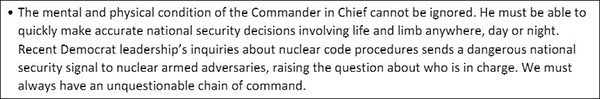 此外,公開信還質疑美國總統拜登的身心健康狀況。信中稱,“這位統帥的身心健康狀況不容忽視。他必須能夠無論白天黑夜,能在任何地方快速、準確地作出涉及國家安全問題的決策”、“我們必須得擁有無可置疑的指揮系統”。