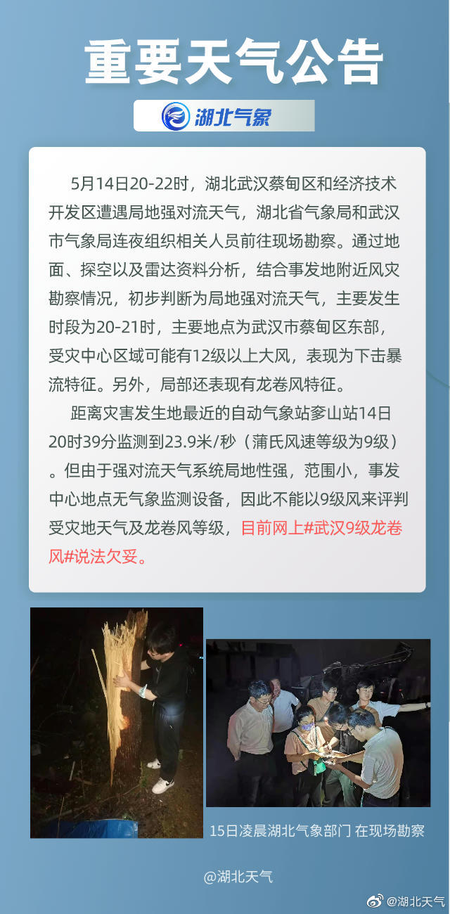 據武漢市應急管理局微信公眾號消息,5月14日20點39分,武漢蔡甸區奓山片區、武漢經開區軍山片區突發9級龍捲風,風速23.9米/秒,部分村灣房屋受損,大量樹木折斷,部分工棚倒塌。災情發生後,省委、省政府主要領導作出批示指示,湖北副省長曹廣晶,武漢市委副書記、市長程用文第一時間趕赴現場指揮組織救援,連夜召開緊急會議部署應急處置工作。