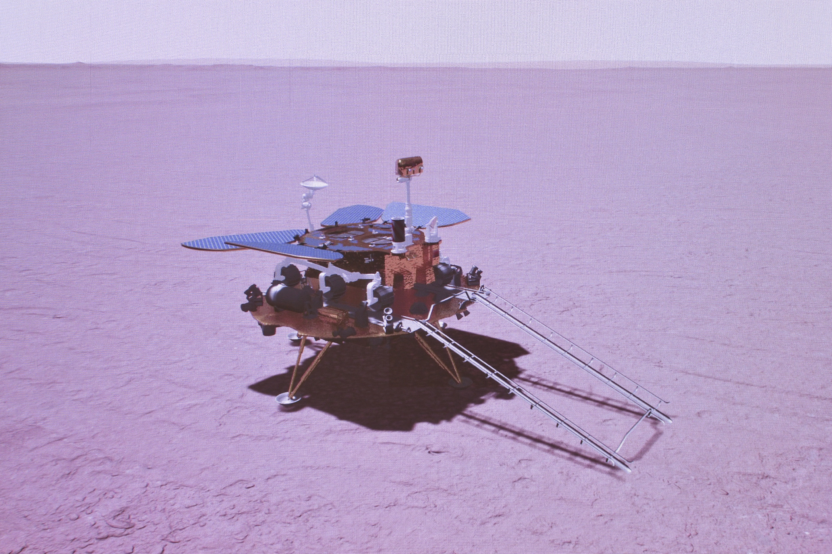 我國首次火星探測任務着陸火星成功,圖為火星探測器着陸火星表面模擬圖(新華社5月15日攝)
