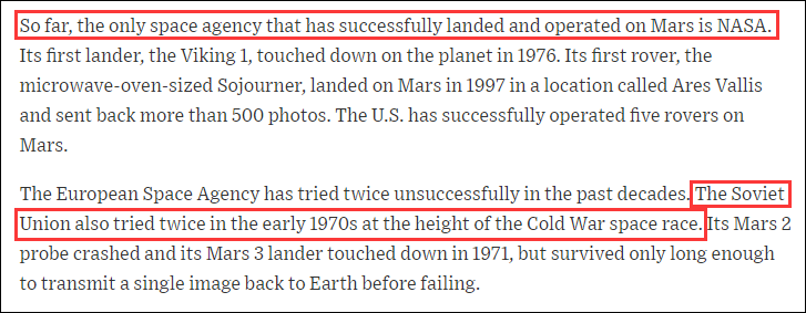 例如《華爾街日報》就強調,到目前為止,NASA是唯一能夠在火星上成功着陸和執行任務的太空機構,除去中國不説,在過去幾十年裏,不僅前蘇聯沒有取得成功,歐洲航天局的兩次嘗試也以失敗告終。
