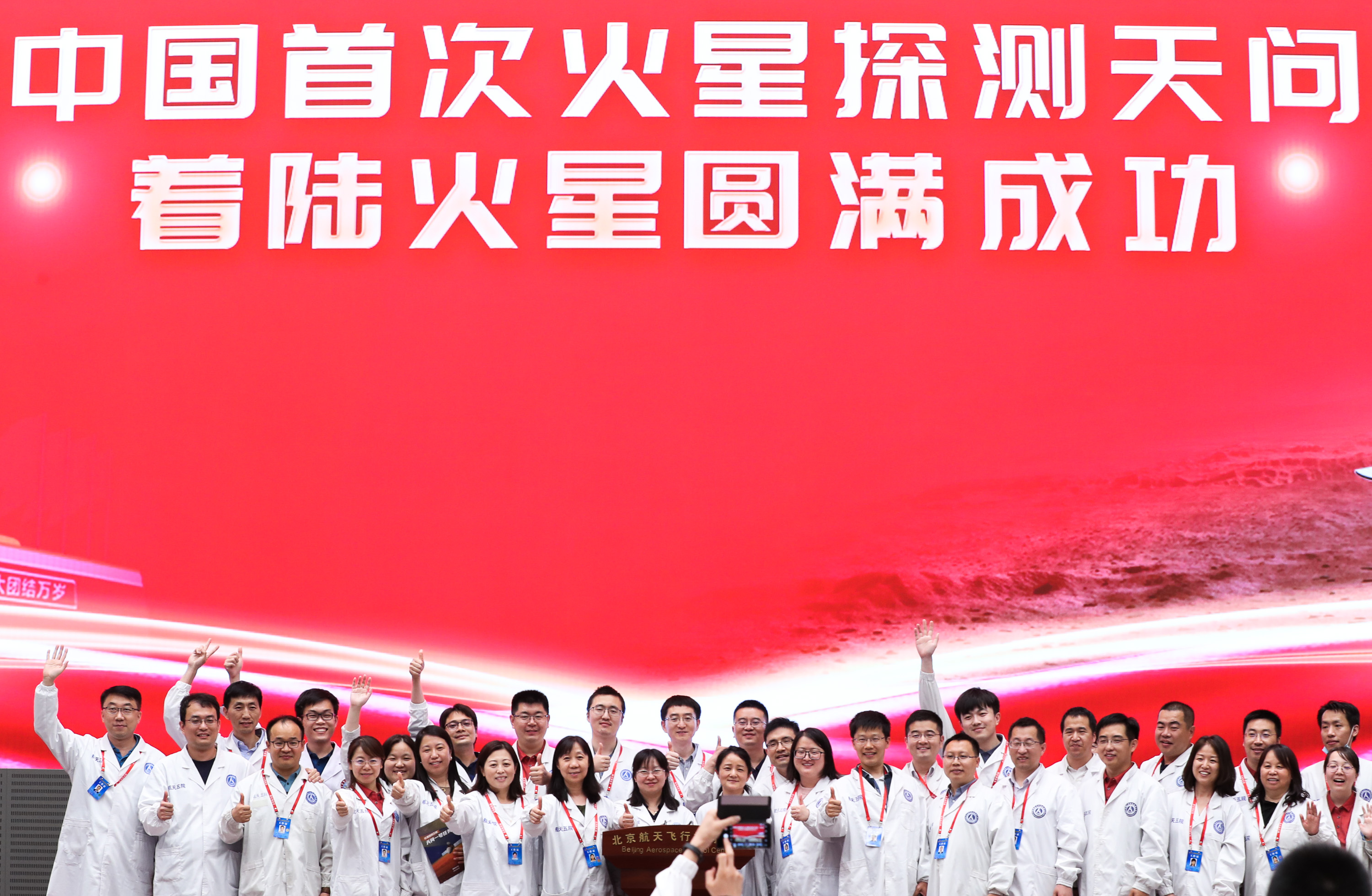 5月15日,航天科研人員在北京航天飛行控制中心指揮大廳慶祝我國首次火星探測任務着陸火星成功。圖自新華社