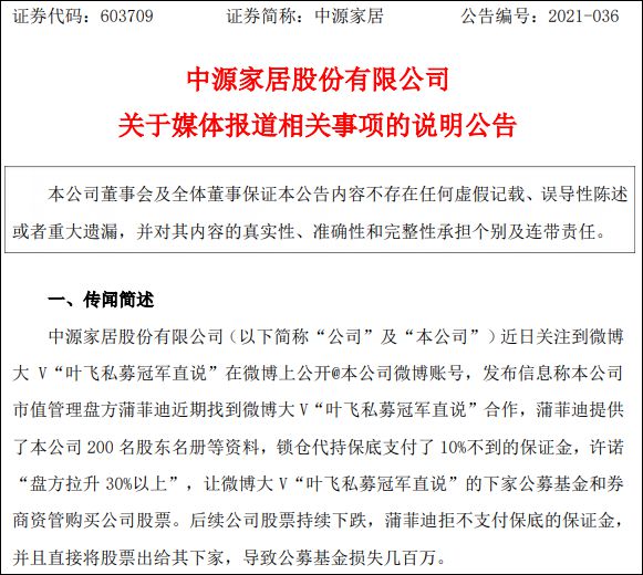 中源家居當天回應,稱公司未直接或通過第三方以口頭或書面形式委託有關盤方購買公司股票,開展“市值管理”,公司實際控制人、公司董事、監事、高級管理人員也未接觸或與蒲菲迪、微博大 V“葉飛私募冠軍直説”相識。