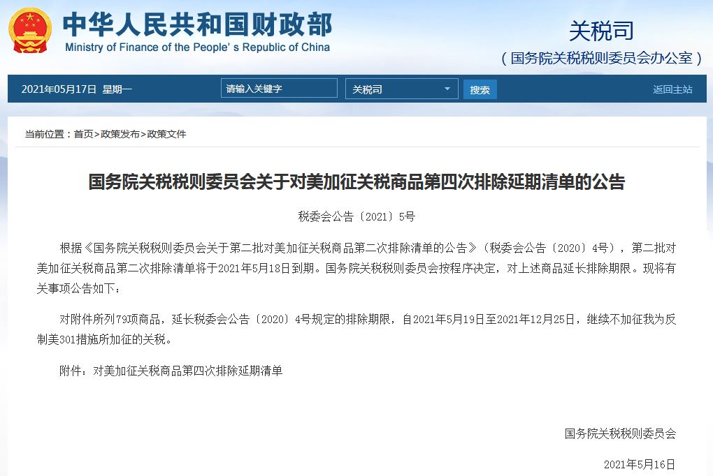 據財政部網站5月17日消息,對美加徵關税商品第四次排除延期清單已經公佈。對附件所列79項商品,自2021年5月19日至2021年12月25日,繼續不加徵我為反制美301措施所加徵的關税。
