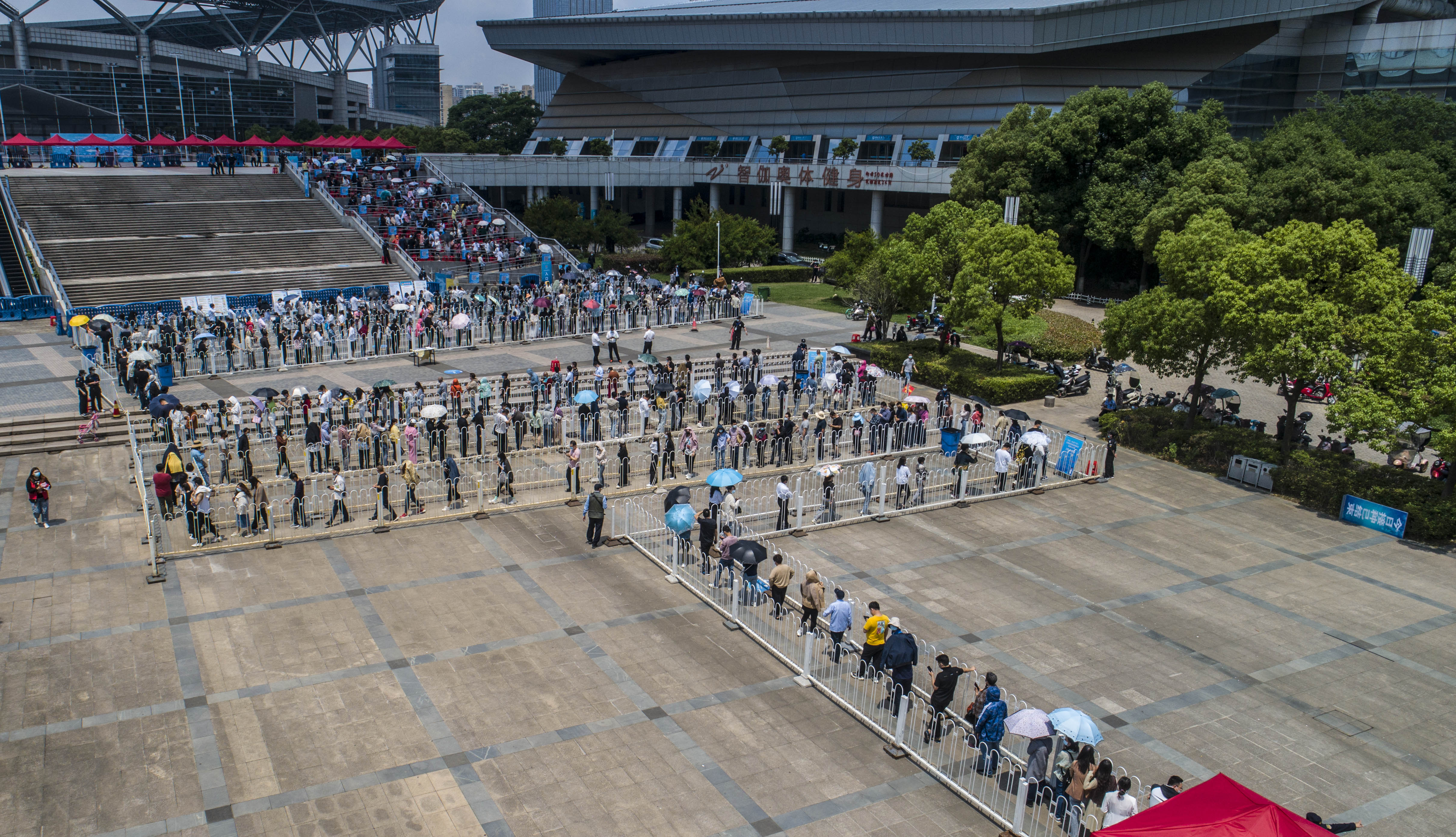 5月17日,安徽合肥,市民在蜀山區奧體中心方艙接種點外排起長隊,有秩序地進行接種。圖|澎湃影像