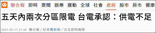 【文/觀察者網 熊超然】據“聯合新聞網”等台媒5月17日報道,繼5月13日全台灣遭遇大規模停電之後,當天晚間島內再度出現多地停電的情況。受此影響,當晚第一輪分區限電户數就達66萬户。
