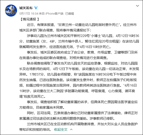 5月17日,蘭州市城關區官方微博(@城關發佈 )就“甘肅蘭州一幼童在幼兒園吃飯時意外死亡”一事發布情況通報: