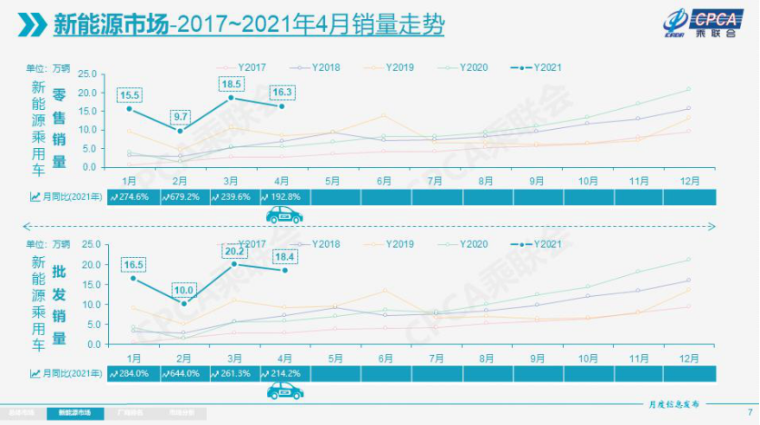 據乘聯會數據,4月份新能源車型乘用車批發銷量達到18.4萬輛,環比3月下降8.7%,同比增長214.2%。在零配件價格波動與芯片因產能不足等原因大幅侵染汽車行業時,國內新能源市場依舊能夠用高速的奔跑態勢持續拉動着市場的提升。