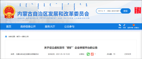 內蒙古發改委網站5月18日消息,內蒙古自治區能耗雙控應急指揮部辦公室發佈《關於設立虛擬貨幣“挖礦”企業舉報平台的公告》: