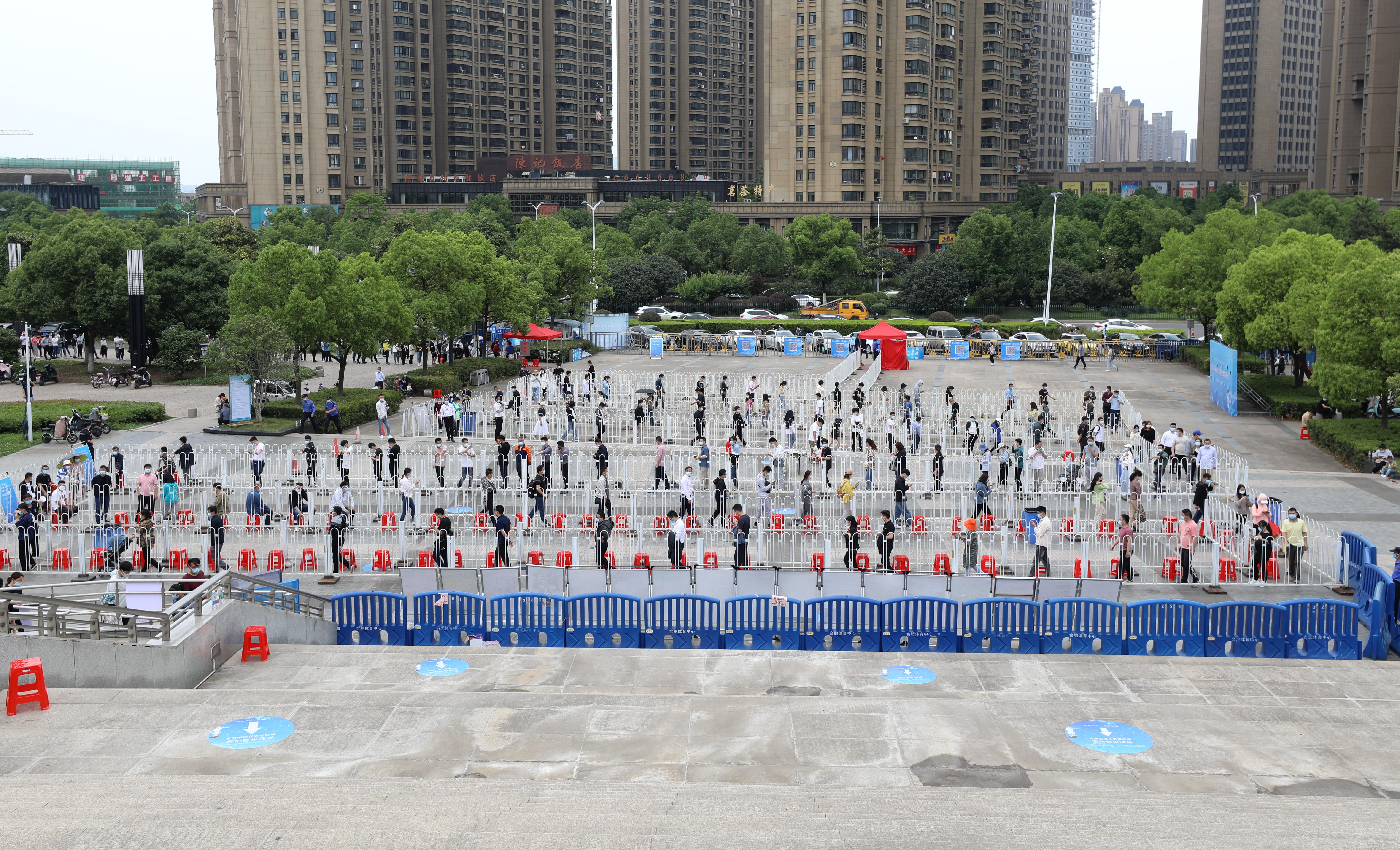5月18日,在合肥市蜀山區奧體中心方艙接種點,市民有序排隊接種新冠疫苗。圖|澎湃影像
