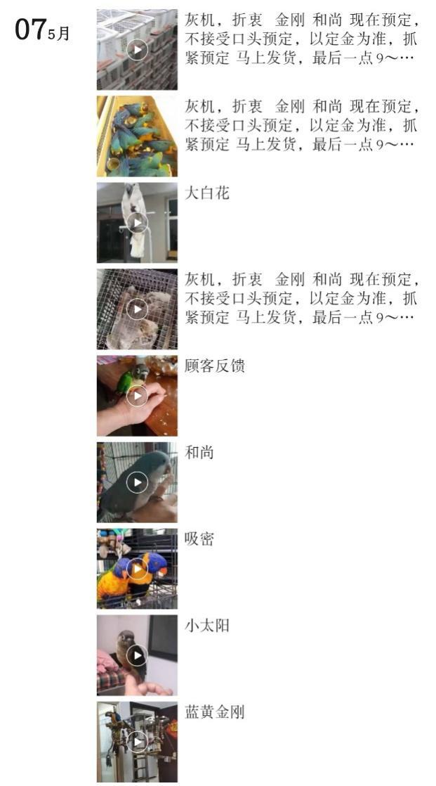 添加了客服後,澎湃新聞記者看到其朋友圈有各類鸚鵡的視頻,並附有“需要的聯繫”、“打包”、“有貨”、“馬上發貨”等詞。客服表示他們有合法養殖證明,灰鸚鵡8900元一隻包郵。