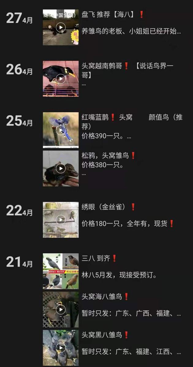 該店鋪客服的微信朋友圈裏,有各種鳥的圖片和價格介紹,包括國家二級保護動物鷯哥、畫眉、百靈等,“三有”保護動物(即,有重要生態、科學、社會價值的陸生野生動物)八哥、秀眼、喜鵲等。