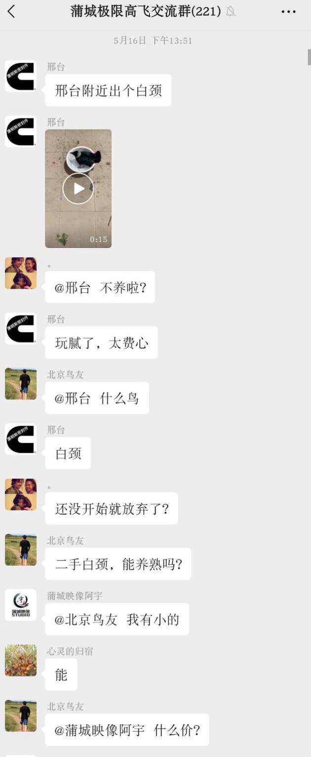 “除了這些平台以外,QQ羣和微信羣現在賣鳥也比較嚴重,而且很難發現。” 一位從事反盜獵的鳥類保護人士對澎湃新聞記者表示,“舉報也就是封羣,沒太大用。這對鳥販子沒有任何實質性的損害,因為那些‘鳥友’也就是他的資源都還在,他完全可以隨時再建一個羣。”