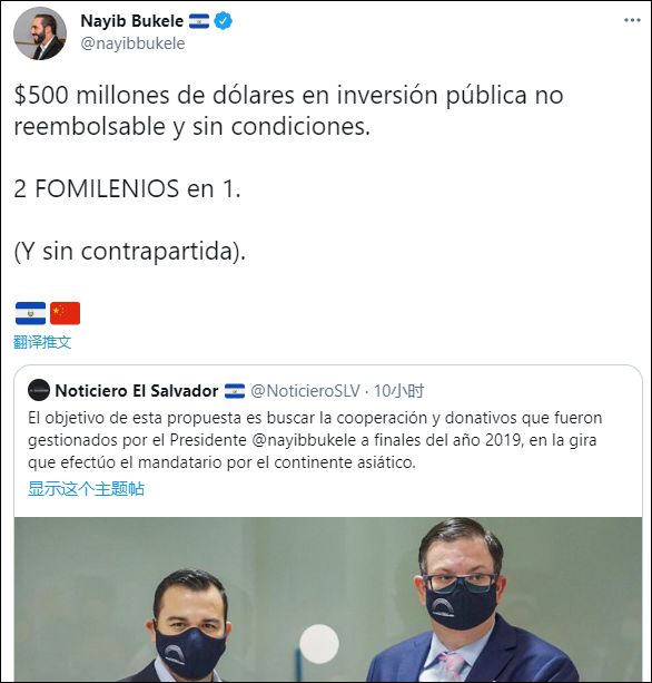 【編譯/觀察者網 李煥宇】 5月18日,薩爾瓦多總統布克爾(Nayib Bukele)在自己的社交媒體賬號上對中國不附加條件的援助和新冠疫苗表示讚賞,他特意強調,中國的援助“不附加條件”。