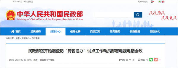 民政部網站5月19日消息,為貫徹落實《國務院關於同意在部分地區開展內地居民婚姻登記“跨省通辦”試點的批覆》,2021年5月19日,民政部召開婚姻登記“跨省通辦”試點工作動員部署電視電話會議。此次會議的目的是堅持以習近平新時代中國特色社會主義思想為指導,全面貫徹黨的十九大和十九屆二中、三中、四中、五中全會精神,深入落實國務院的決策部署,統一思想認識,精心組織實施,確保婚姻登記“跨省通辦”試點工作順利開展。民政部黨組成員、副部長詹成付出席會議並講話。