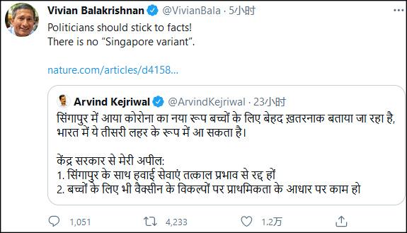 相關言論也引起了新加坡外交部的關注。據新加坡《聯合早報》報道,新外交部於19日會見了印度駐新加坡高級專員(大使),稱這一“沒有根據的指控”讓新方感到失望。新加坡外長維文隨後還發推批評了凱傑裏瓦爾的言論:“政客應該堅持事實!並不存在‘新加坡變異病毒’。”