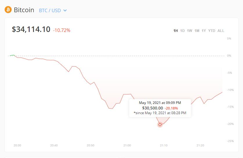 比特幣一度跌至30500美元,24小時最大跌幅近30%