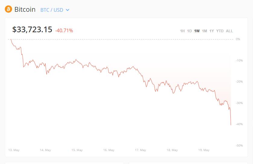 據位於盧森堡的比特幣交易站Bitstamp實時數據顯示,5月19日,全球加密貨幣遭遇重挫,比特幣一度跌至30500美元/枚,24小時內最大跌幅接近30%。而自5月12日起,比特幣由57808美元高位下跌至目前的3.3萬美元位置,一週縮水已超40%。