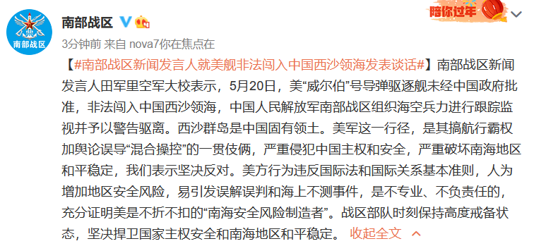 @南部戰區 5月20日發文:南部戰區新聞發言人田軍裏空軍大校表示,5月20日,美“威爾伯”號導彈驅逐艦未經中國政府批准,非法闖入中國西沙領海,中國人民解放軍南部戰區組織海空兵力進行跟蹤監視並予以警告驅離。
