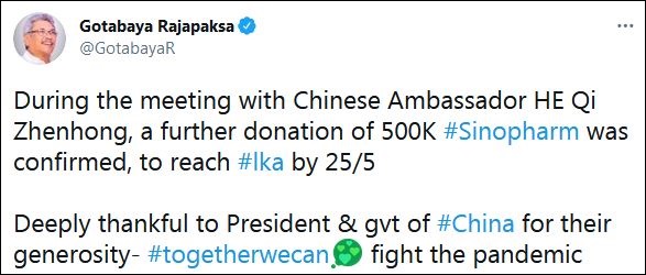 “與中國(駐斯里蘭卡)大使戚振宏會面期間,(雙方)確認了一項50萬劑中國國藥疫苗的進一步捐贈(計劃),”拉賈帕克薩在推文中寫道,“深深地感謝中國政府和領導人的慷慨,讓我們一起抗擊疫情。”推文下面,拉賈帕克薩還附上了與戚振宏大使的合照。