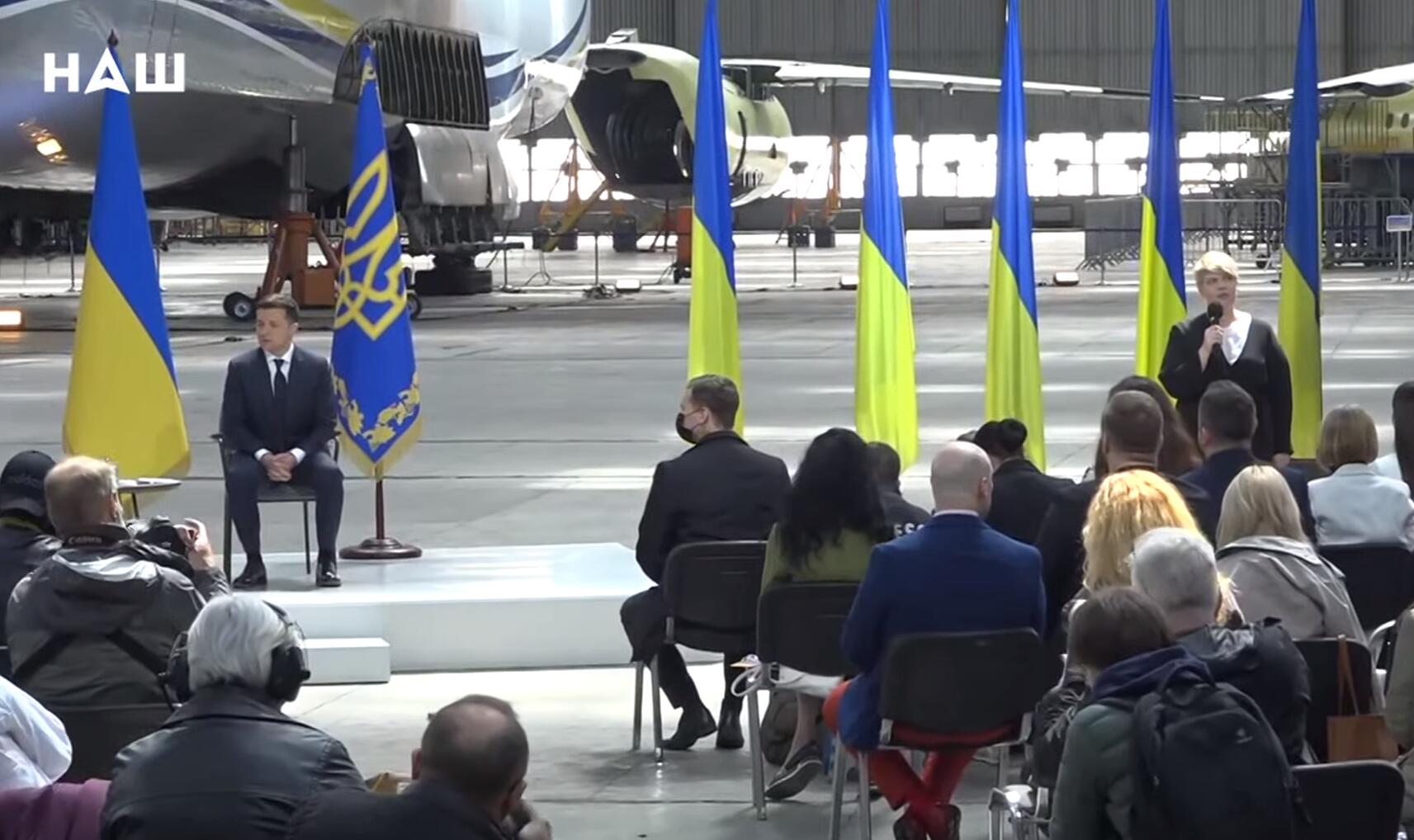 澤連斯基5月20日的新聞發佈會選在機庫中舉行,其身後是沒有發動機的蘇聯安-124重型運輸機,當他走向座椅時,機庫中的貓望風而逃