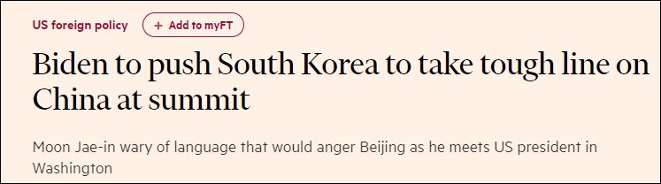 五名知情人士同樣告訴《金融時報》,作為“與盟友合作反擊中國戰略”的一部分,白宮希望文在寅在首腦峯會期間發表的聯合聲明中,支持對華強硬的措辭。