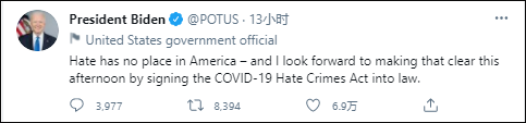 據美聯社報道,在白宮東廳舉行的活動上,拜登感謝兩黨議員通過《反新冠仇恨犯罪法》。拜登表示,反對仇恨和種族主義是使美國人團結在一起的原因。拜登還説,仇恨和種族主義是“長期困擾和折磨我們國家的醜陋毒藥”。