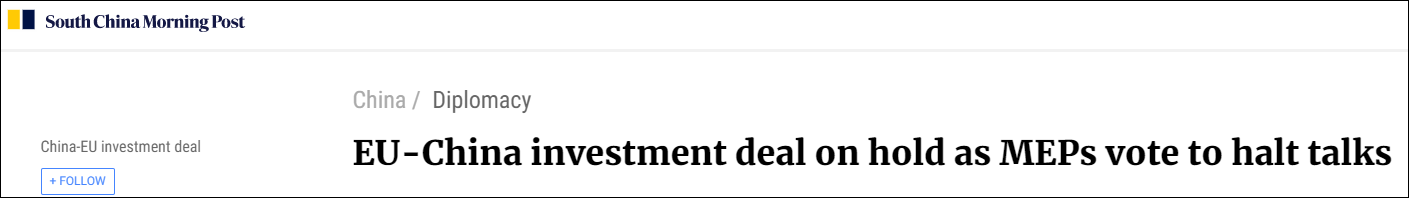 這項動議要求歐洲議會暫停批准中歐投資協定,直到中國解除一系列對歐制裁,但這“不影響協定批准程序的最終結果”。路透社指出,該動議並不具有任何法律效力,但卻體現了歐洲議會的“官方立場”,即:歐中關係可能不會再繼續保持正常了。