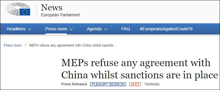 而在20日動議表決通過後,彼蒂科菲爾又大放厥詞道:“中國的制裁是錯誤的,他們應該從錯誤中吸取教訓,重新思考。由於發起制裁,中歐投資協定也被凍結了。”同時,他還宣稱:“中方非常想達成中歐投資協定,但他們計算錯誤,低估了歐洲議會捍衞歐洲利益和價值觀的決心。”