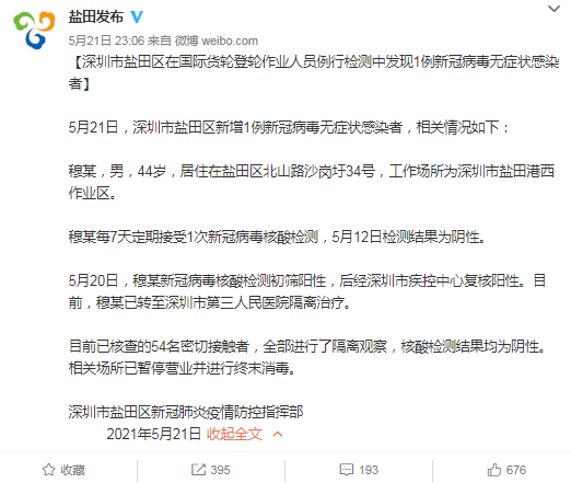 中共深圳市鹽田區委宣傳部官方微博(@鹽田發佈 )21日晚發佈消息稱,深圳市鹽田區在國際貨輪登輪作業人員例行檢測中發現1例新冠肺炎無症狀感染者。相關情況如下: