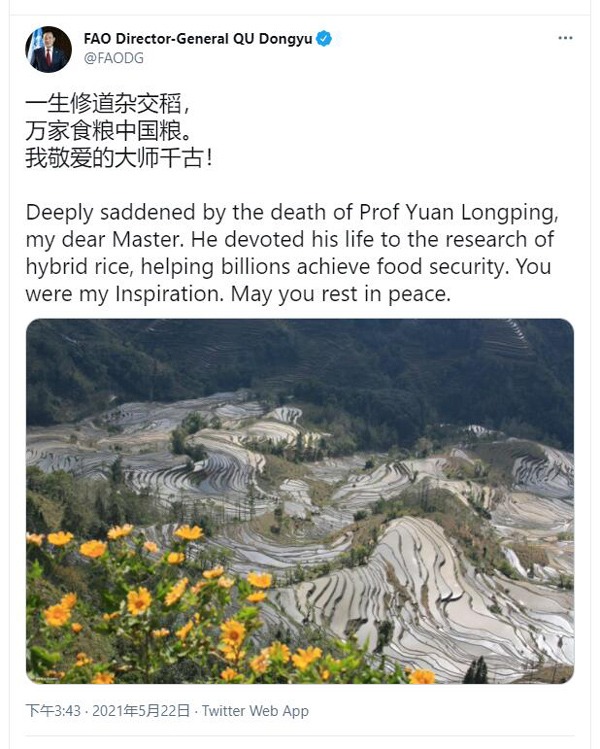 聯合國糧農組織總幹事屈冬玉當天也在推特上發文:“一生修道雜交稻,萬家食糧中國糧。我敬愛的大師千古!”