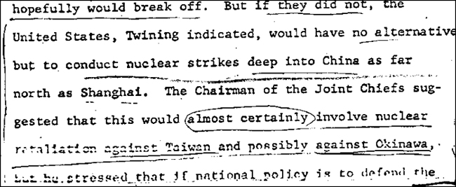 根據這份機密文件的內容,在1958年炮擊金門開始兩天後(8月25日),時任美國空軍太平洋司令部指揮官勞倫斯•庫特(Laurence Kuter)就向美國政府要求核武器授權。他認為,如果局勢升級,在美軍不首先使用核武器的情況下,美國空軍以常規武器手段“協防颱灣離島”的計劃缺乏勝算。
