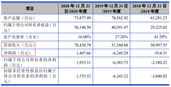 2018年至2020年(報告期內),東芯半導體分別實現營業收入5.1億元、5.14億元、7.84億元,同期淨利潤則分別為-914.31萬元、-6249.29萬元、1407.66萬元。