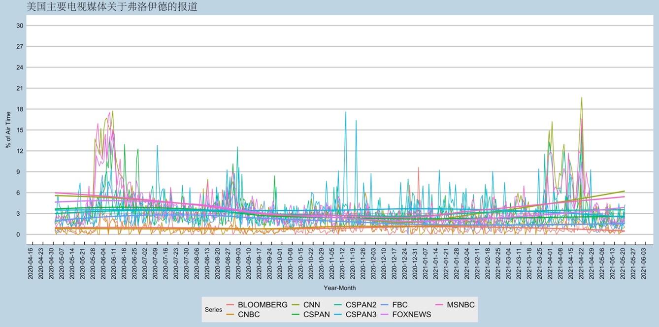 通過檢索新聞媒體數據庫(GDELT)可以看出,相關媒體對於“黑人命也是命”的報道在2013年出現一個高峯之後就基本歸於沉寂。直到弗洛伊德事件出現,在2020年六月份抗議高點和今年四月份肖萬被宣判的時候各自出現兩個高峯。