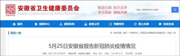 安徽省衞健委網站消息,2021年5月24日0-24時,安徽省報告新增確診病例2例(均在六安市,其中1例為無症狀感染者轉為確診病例),無新增疑似病例,新增無症狀感染者1例(六安市)。
