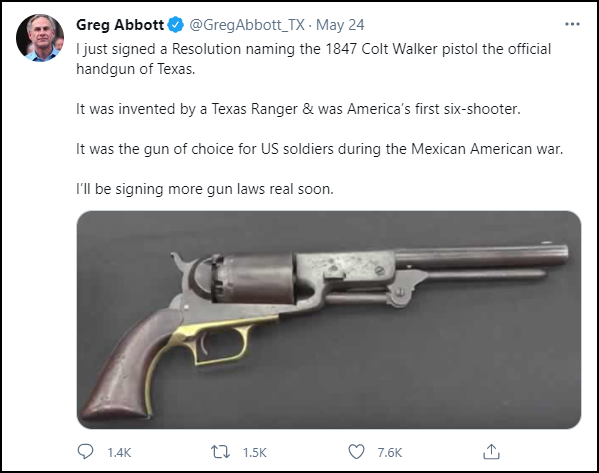 在得州,擁槍是官員爭取支持的手段之一。州長阿伯特剛於5月24日簽署了一項決議,規定1847年在得州發明的柯爾特沃克左輪手槍(Colt Walker pistol)為得州的官方手槍。這也是美國首把六發左輪。阿伯特同日發推稱“我還將在最近簽署更多有關槍支的法律。”