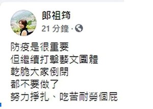 台灣藝人郎祖筠所在的劇團受到影響,舞台劇被迫暫停演出,她在臉書上抱怨説:“防疫是很重要,但繼續打擊文藝團體,乾脆大家倒閉,都不要做了,努力掙扎、吃苦耐勞個屁。”此番言論招致了廣泛批評,郎祖筠隨後刪除了帖文。