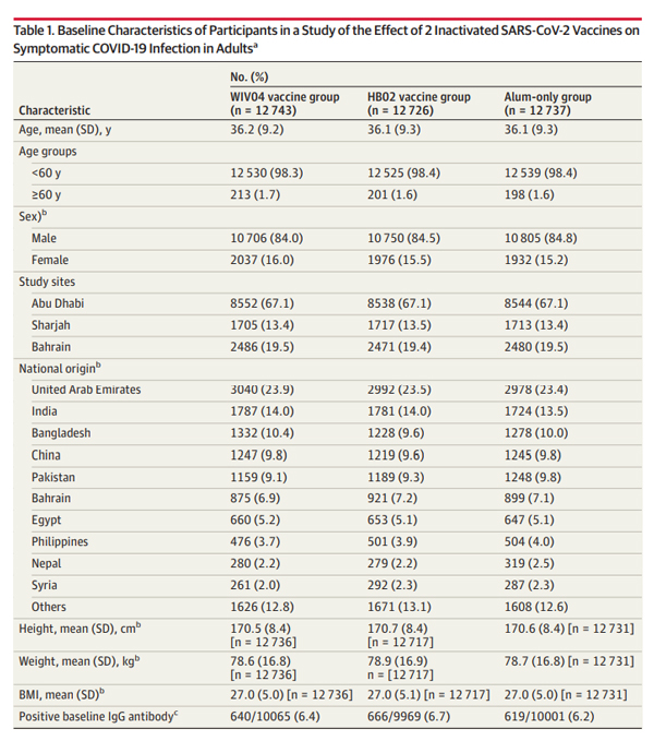 項目中受試者平均年齡為36.1歲,84.4%為男性。25634人(67.1%)來自阿聯酋阿布扎比,5135人(13.4%)來自阿聯酋沙迦,7437人(19.5%)來自巴林。各組間的所有特徵均無顯著性差異。