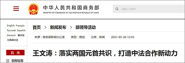 據中國商務部5月26日消息,商務部部長王文濤25日與法國外貿部長級代表李斯特舉行視頻會談時稱,希望法方發揮積極作用,推動中歐投資協定儘早簽署生效。