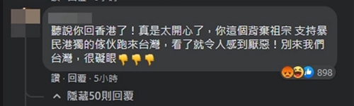 “港獨”藝人黃秋生26日在宣傳新舞台劇時遭台灣網友怒斥:“聽説你回香港了!真是太開心了,你這個背棄祖宗、支持暴民港獨的傢伙跑來台灣,看了就令人感到厭惡!別來我們台灣,很礙眼。”