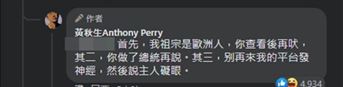黃秋生不甘示弱,隨即曝出一番令人大跌眼球的言論:“首先,我祖宗是歐洲人,你查看後再吠,其二,你做了總統再説。其三,別再來我的平台發神經,然後説主人礙眼。”