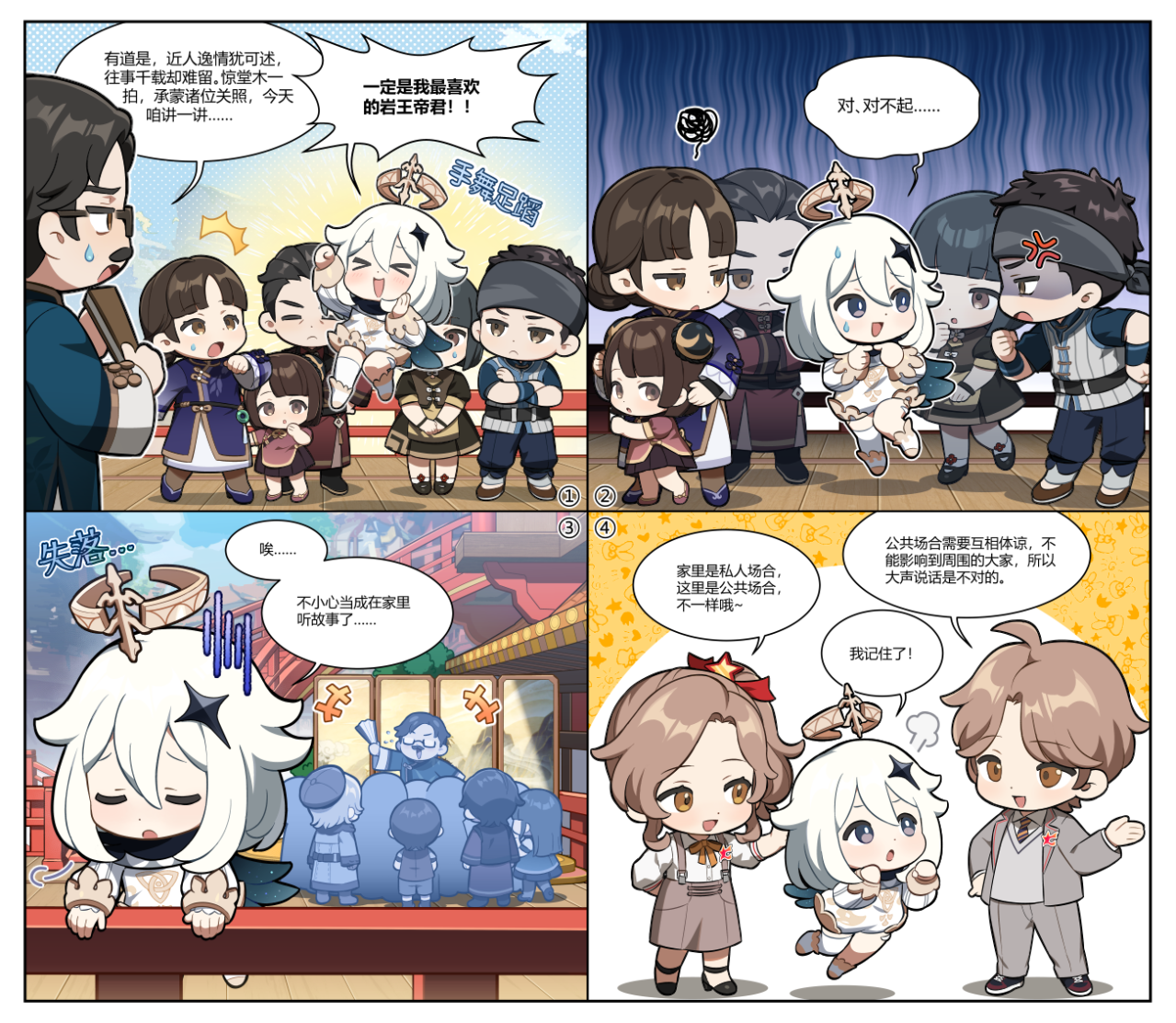 比如在此次徐匯團區委與米哈遊團委舉辦的聯名活動上,《原神》人氣角色派蒙在以新時代文明實踐為主題的四格漫畫中扮演了主角,並肩負了一項重要使命——向青少年們傳遞新時代的文明守則,如節約糧食、公共場合不喧鬧等等。